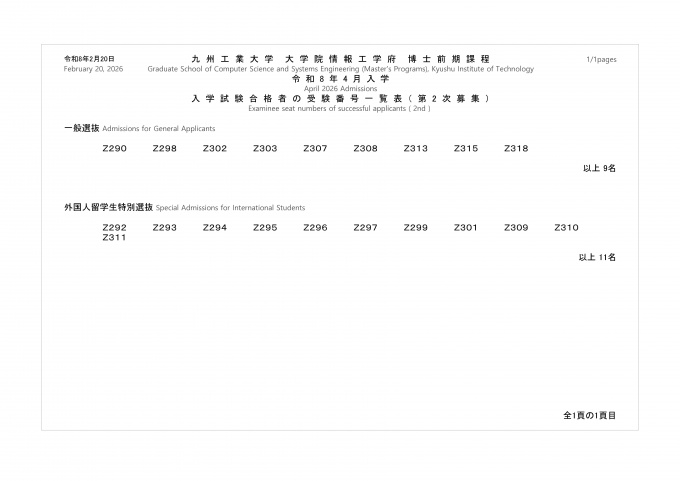 Announcement of Examination Results - Graduate School of Computer Science and Systems Engineering (Master's Programs) / For Admissions in April 2026