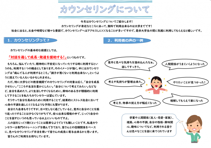 カウンセリング室のHPより、「心の健康?学生生活セルフチェック」や「メール相談」などが出来ます。お気軽にご連絡ください。ご予約お待ちしています。
